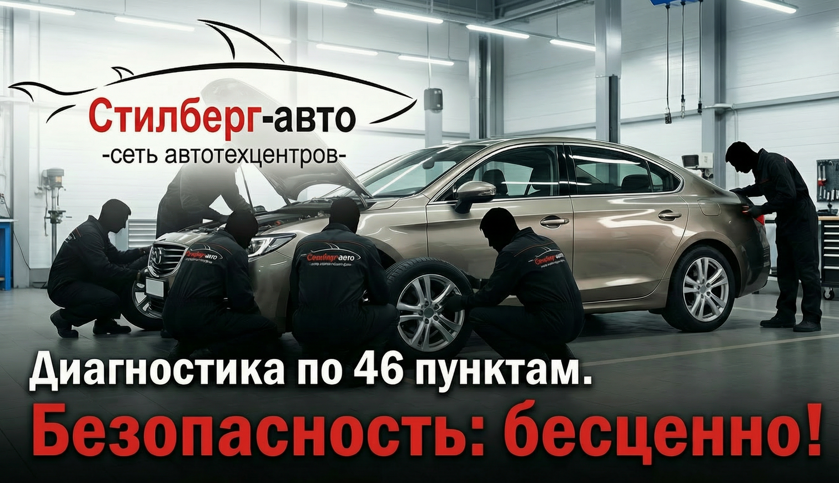 Забота о безопасности начинается с проверки. В «Стилберг‑авто» вы можете получить бесплатную комплексную диагностику* вашего автомобиля по 46 ключевым пунктам — и выявить скрытые проблемы до того, как они станут серьёзными!